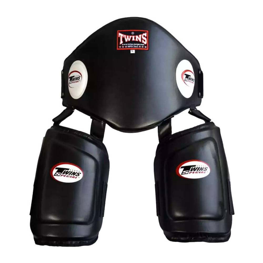 Twins BEPTS1 Belly and Upper Leg Protection is professional training equipment designed for Muay Thai, MMA, and kickboxing, especially ideal for coaches during sparring and technical drills. The set consists of a durable belly pad and upper leg protector made from high-quality Skintex material with multi-layered, anatomically shaped foam padding that provides maximum protection for the abdomen, ribs, lower torso, and thighs. Thanks to the adjustable Velcro closure, the protectors fit perfectly, are comfortable to wear, and allow full freedom of movement during dynamic training sessions. Handmade in Thailand, the Twins BEPTS1 guarantees excellent craftsmanship, long-lasting durability, and reliable performance. It is an essential choice for any coach who values safety, durability, and a professional training standard.